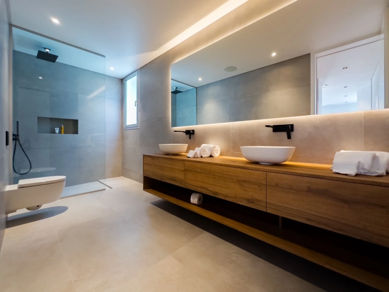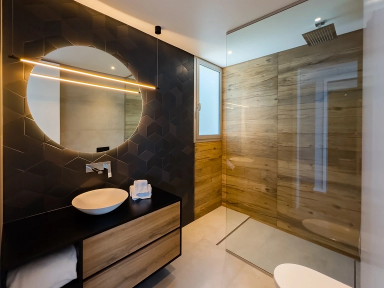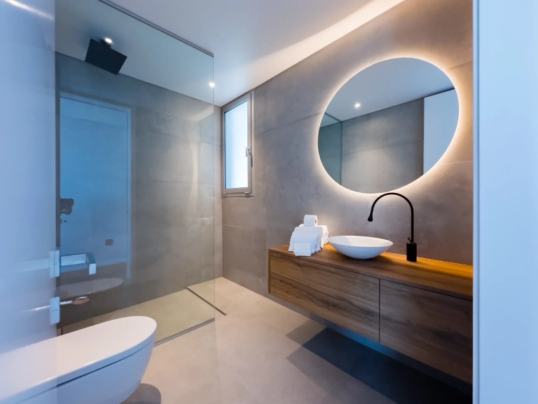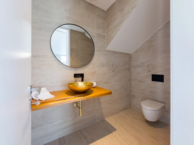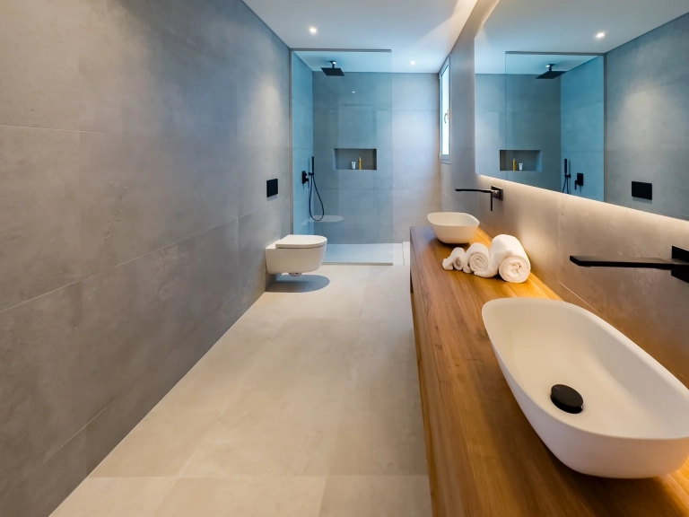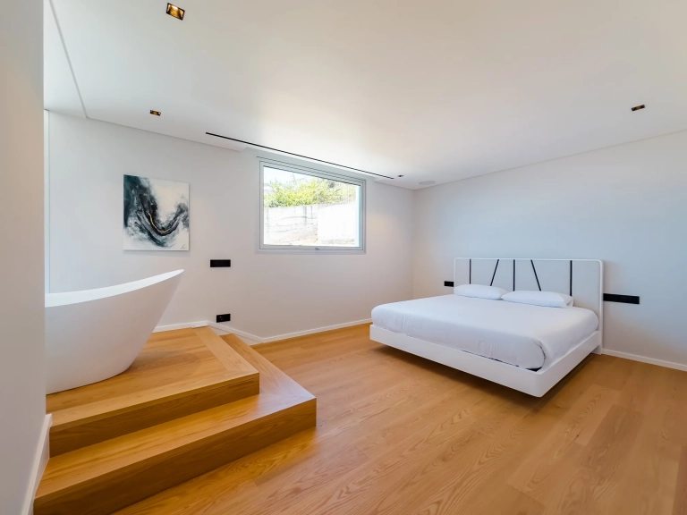 The villa features a state-of-the-art kitchen equipped with top-of-the-line Miele appliances. Enjoy an integrated luxury sound system by Sonos throughout the house and central air conditioning for ultimate comfort. The pool is among the largest in the area and is heated 24/7 using solar power energy for maximum efficiency and sustainability. The spacious parking area accommodates up to four cars.