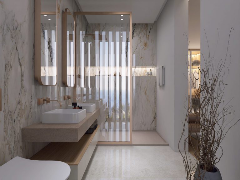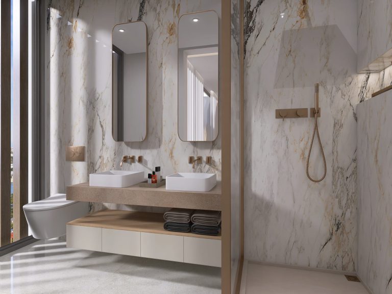 Bathrooms are outfitted with Geberit fixtures and sleek Tres taps, offering a spa-like experience.