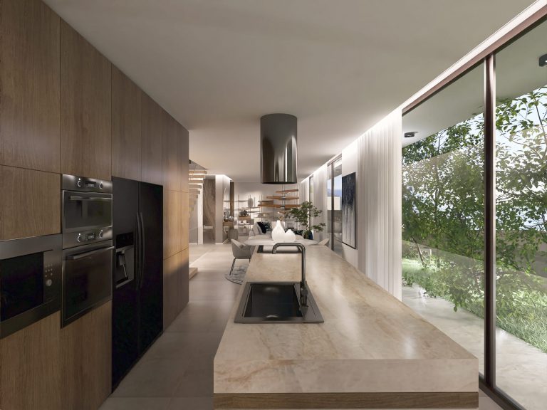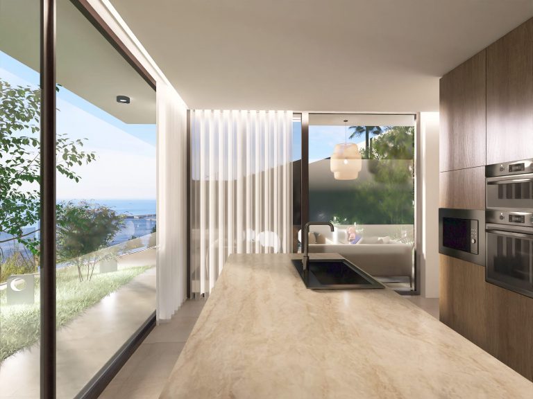 The sophisticated kitchen is a chef’s dream, outfitted with bespoke cabinetry finished in rich Jatobá veneer and equipped with top-of-the-line Miele appliances, including an induction hob, built-in coffee machine, and discreet extractor fan.